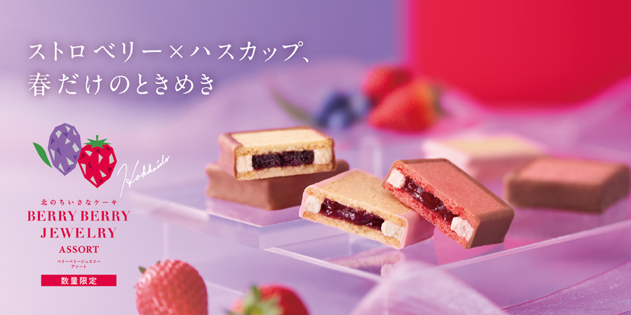 苺とハスカップをブレンドしたベリージャムとバタークリームを薄焼きバタークッキーでサンド。ピンクカラーのチョコレートで包んだ「ベリーベリージュエリー」は、このアソートだけで味わえる限定品。