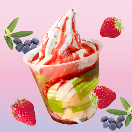 さっぱりとしたソフトクリームに、北海道産ストロベリーとハスカップを使った特製ソースをたっぷりと。