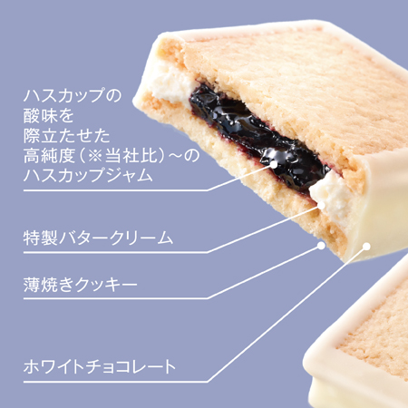 通常よりもハスカップの酸味を際立たせた高純度(※当社比)のハスカップジャムと特製バタークリームを薄焼きのクッキーでサンド。