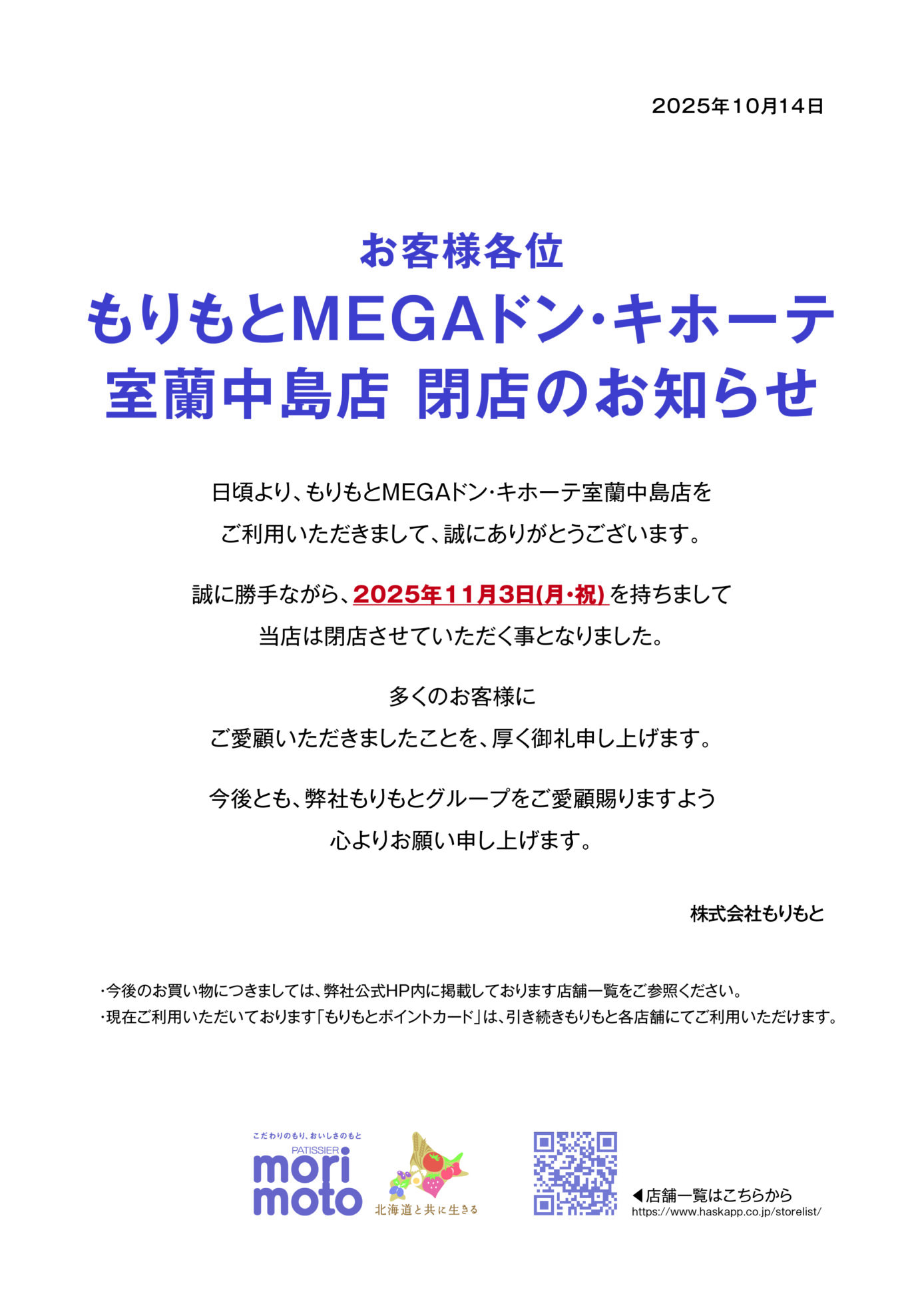 【重要】もりもとMEGAドン・キホーテ室蘭中島店 閉店のお知らせ